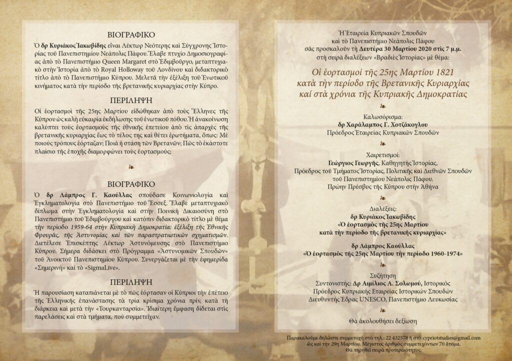 Βραδιές Ιστορίας με θέμα: Οι εορτασμοί της 25ης Μαρτίου 1821 κατά την περίοδο της Βρεττανικής Κυριαρχίας και στα χρόνια της Κυπριακής Δημοκρατίας