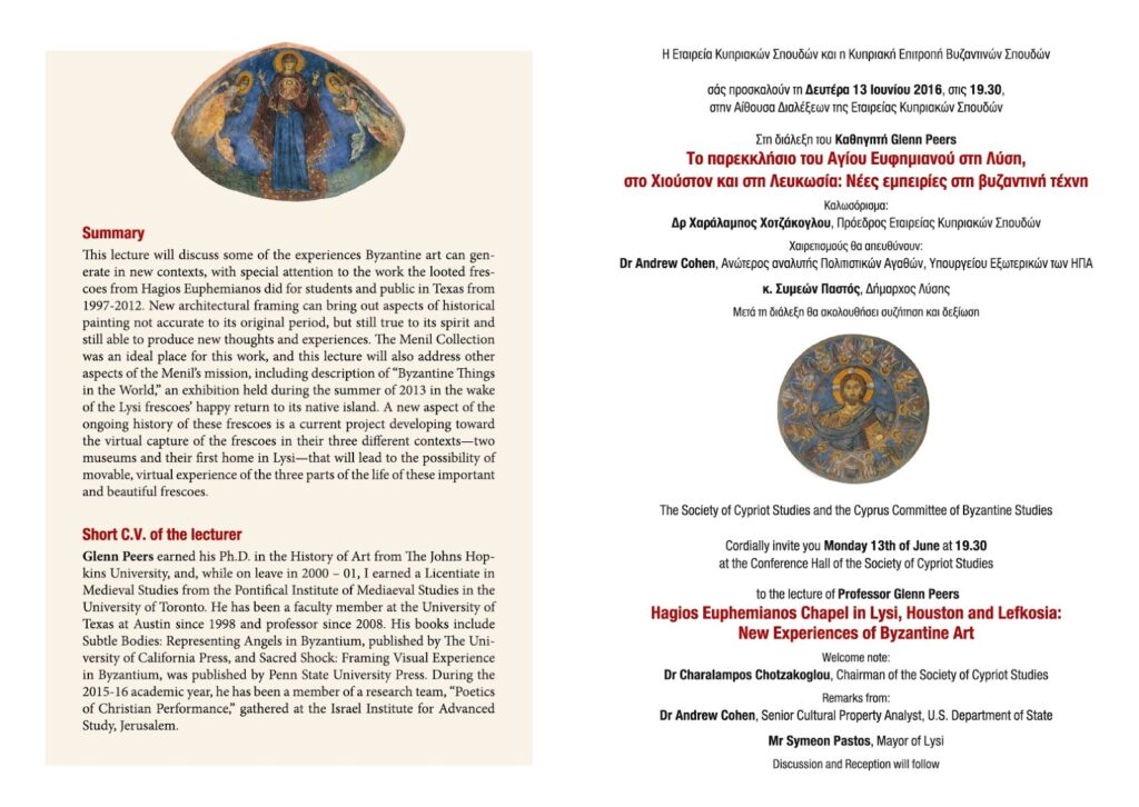 Διάλεξη του Καθηγητή Glenn Peers, Το παρεκκλήσιο του Αγίου Ευφημιανού στη Λύση, στο Χιούστον και στη Λευκωσία: Νέες εμπειρίες στη βυζαντινή τέχνη