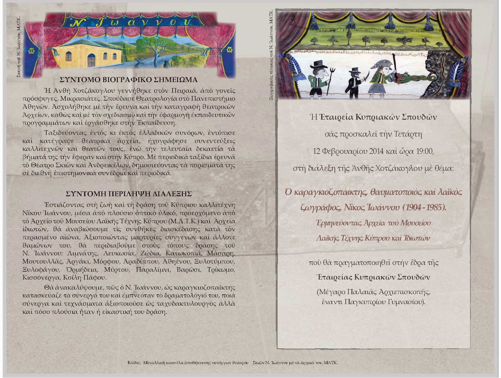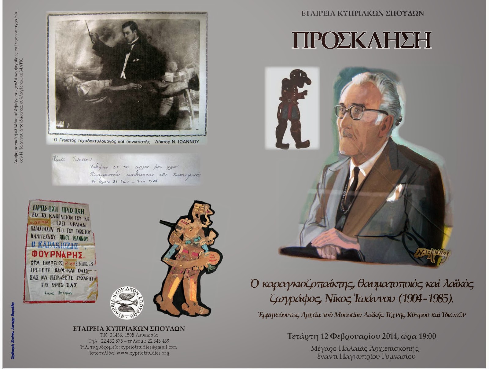 Ἡ Ἑταιρεία Κυπριακῶν Σπουδῶν σᾶς προσκαλεῖ τὴν Τετάρτη 12 Φεβρουαρίου 2014 καὶ ὤρα 19:00, στὴ διάλεξη τῆς Ἀνθῆς Χοτζάκογλου μὲ θέμα: Ὁ καραγκιοζοπαίκτης, θαυματοποιὸς καὶ λαϊκὸς ζωγράφος, Νῖκος Ἰωάννου ( 1904 – 1985 ). Ἑρμηνεύοντας Ἀρχεῖα τοῦ Μουσείου Λαϊκῆς Τέχνης Κύπρου καὶ Ἰδιωτῶν ποὺ θὰ πραγματοποιηθεῖ στὴν ἕδρα τῆς Ἑταιρείας Κυπριακῶν Σπουδῶν(Μέγαρο Παλαιᾶς Ἀρχιεπισκοπῆς,ἔναντι Παγκυπρίου Γυμνασίου).