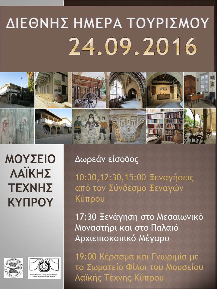 Το Μουσείο Λαϊκής Τέχνης Κύπρου της Εταιρείας Κυπριακών Σπουδών και οι Φίλοι του Μουσείου Λαϊκής Τέχνης Κύπρου σας προσκαλούν το Σάββατο, 24 Σεπτεμβρίου στους χώρους του μουσείου στα πλαίσια του εορτασμού της Διεθνούς Ημέρας Τουρισμού. Η είσοδος θα είναι δωρεάν και το μουσείο θα είναι ανοιχτό από τις 9 το πρωί έως τις 7 το απόγευμα. Παράλληλα θα γίνουν οργανωμένες ξεναγήσεις από τον Σύνδεσμο Ξεναγών Κύπρου στις 10:30, 12:30 και 15:00..