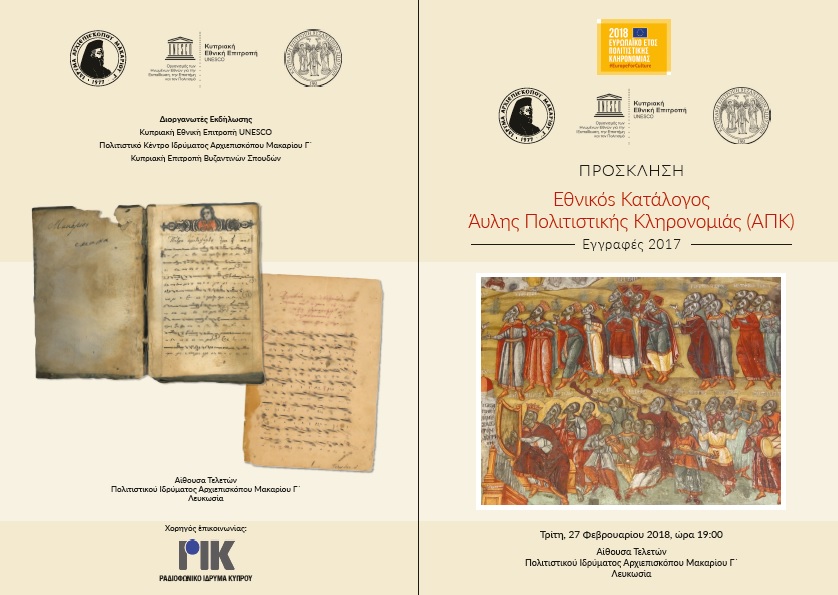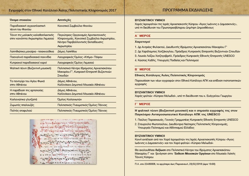 Εθνικός Κατάλογος Άυλης Πολιτιστικής ΚληρονομιάςΠαρουσίαση των νέων εγγραφών στον Εθνικό Κατάλογο ΑΠΚ και επίδοση πιστοποιητικών εγγραφήςΒΥΖΑΝΤΙΝΟI YΜΝΟΙΧορός ψαλτών «Κύπριοι Μελωδοί», υπό τη διεύθυνση του κ. Ευάγγελου Γεωργίου