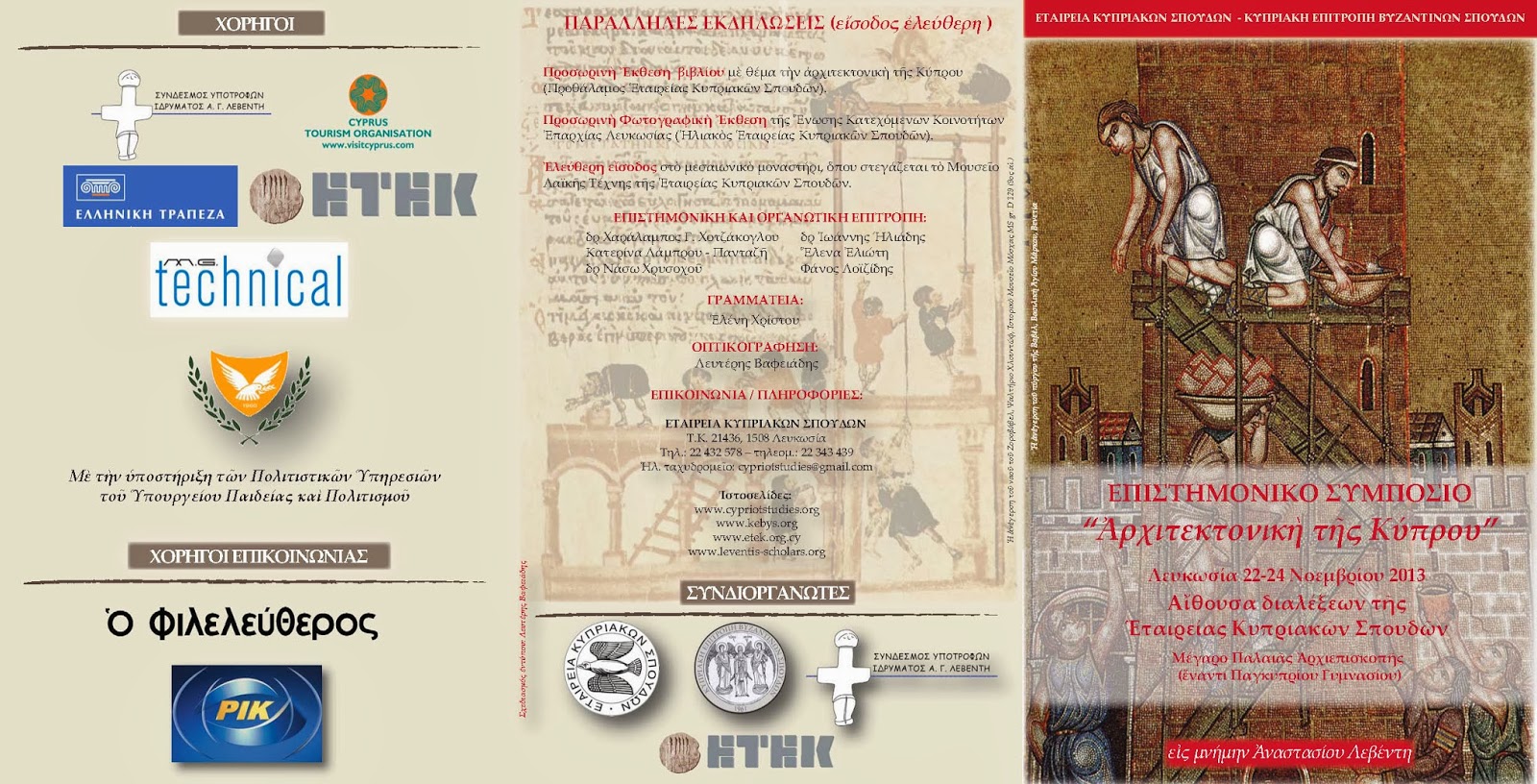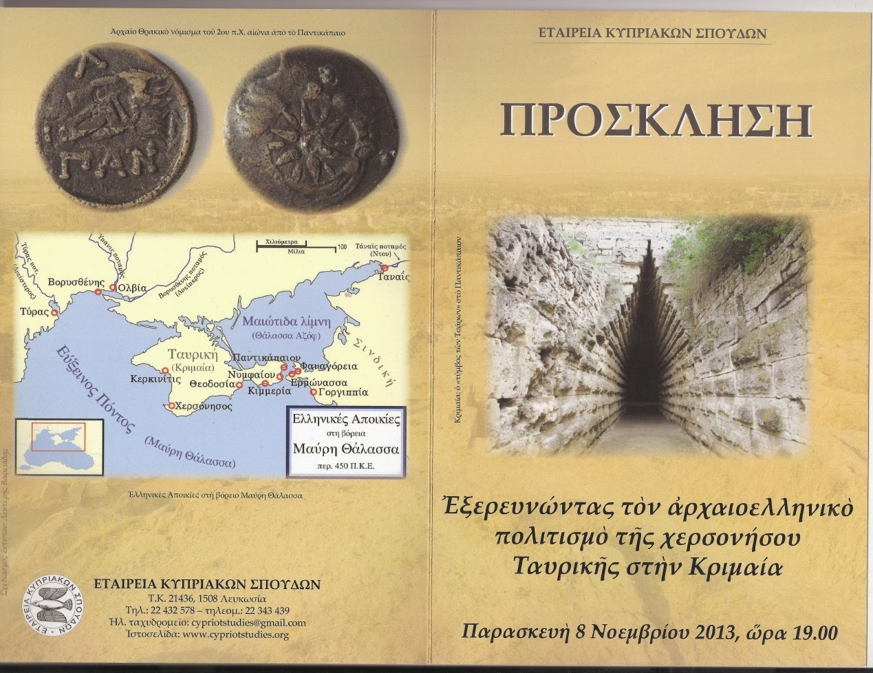 Η Εταιρεία Κυπριακών Σπουδών σας προσκαλεί την Παρασκευή, 8 Νοεμβρίου 2013 και ώρα 19.00, σε διάλεξη του ιστορικού Ηλία Πετρόπουλου με θέμα: “Εξερευνώντας τον αρχαιοελληνικό πολιτισμό της χερσονήσου Ταυρικής στην Κριμαία”η οποία θα πραγματοποιηθεί στην Εταιρεία Κυπριακών Σπουδών (Μέγαρο Παλαιάς Αρχιεπισκοπής, έναντι Παγκυπρίου Γυμνασίου). Θα ακολουθήσει δεξίωση (Διάρκεια εκδήλωσης 60 λεπτά).