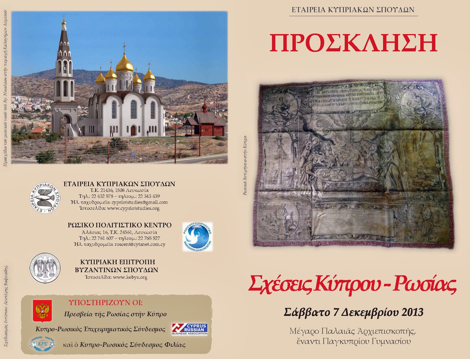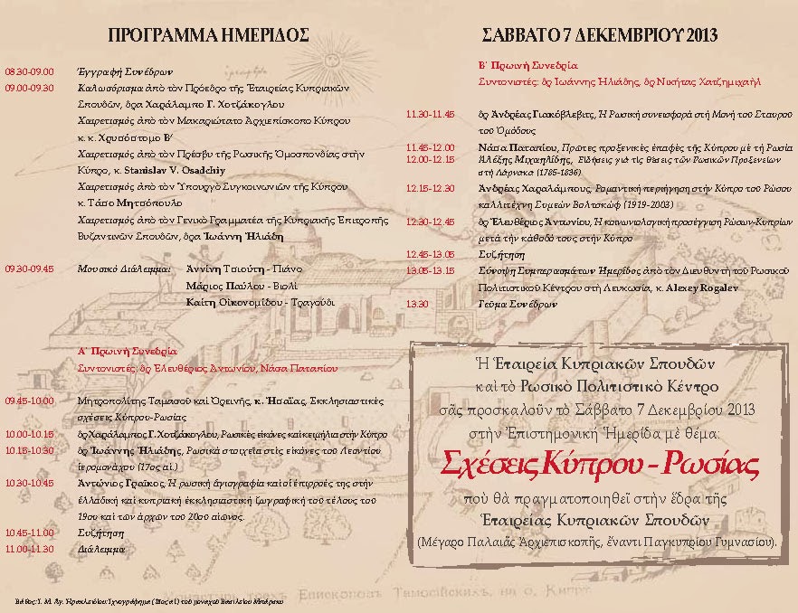 Η Εταιρεία Κυπριακών Σπουδών, το Ρωσικό Πολιτιστικό Κέντρο και η Κυπριακή Επιτροπή Βυζαντινών Σπουδών συνδιοργανώνουν το Σάββατο 7 Δεκεμβρίου στις 09.00 επιστημονική Ημερίδα με θέμα: «Σχέσεις Κύπρου-Ρωσία» στην Εταιρεία Κυπριακών Σπουδών (Μέγαρο Παλαιάς Αρχιεπισκοπής έναντι Παγκυπρίου Γυμνασίου). Πρόκειται για το πρώτο σχετικό επιστημονικό συμπόσιο στην Κύπρο της θεματικής αυτής.