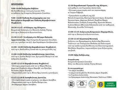 ΠΡΟΓΡΑΜΜΑ9:00-14:00 Παζαράκι Βιβλίου.Θα διατίθενται με έκπτωση έως και 70%οι εκδόσεις της Εταιρείας Κυπριακών Σπουδών.