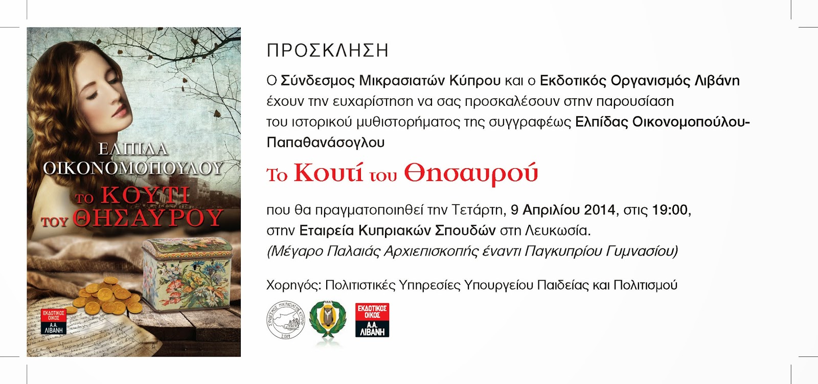 Παρουσίαση ιστορικού μυθιστορήματος Ελπίδας Οικονομοπούλου – Παπαθανάσογλου, Το Κουτί του Θησαυρού
