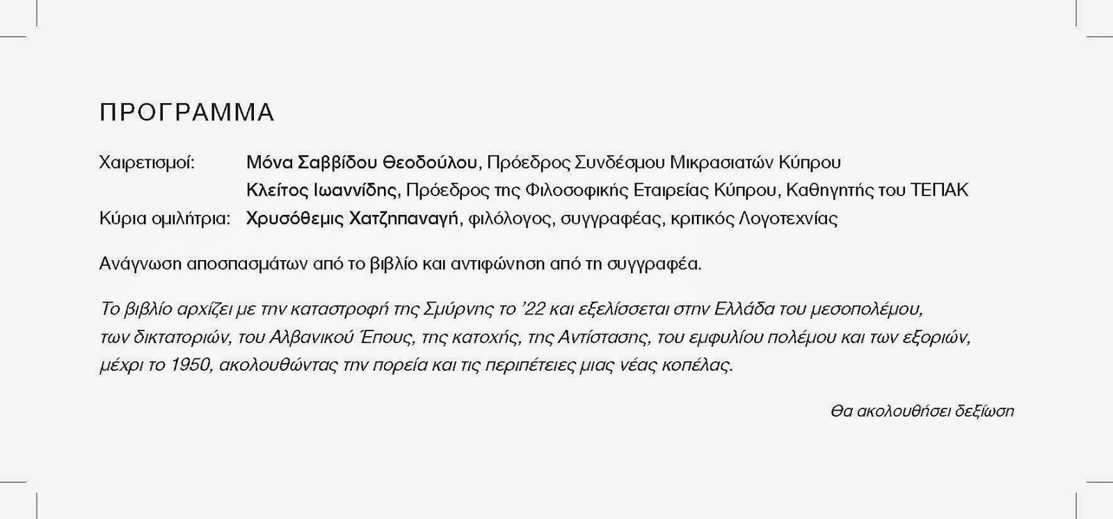 στις 19:00 στην Εταιρεία Κυπριακών Σπουδών στη Λευκωσία (Μέγαρο Παλαιάς Αρχιεπισκοπής έναντι Παγκυπρίου Γυμνασίου)