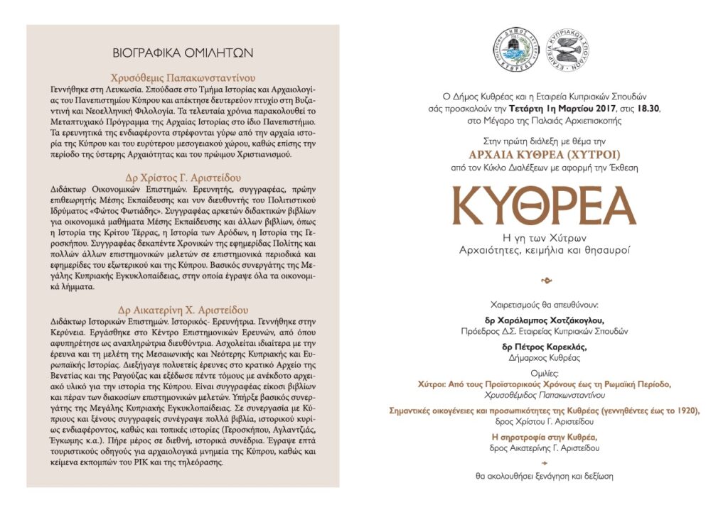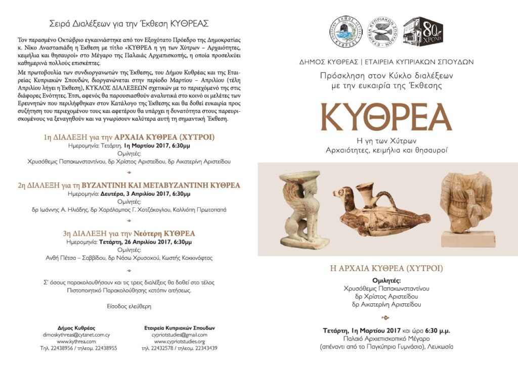 Με πρωτοβουλία και πάλιν των συνδιοργανωτών της Έκθεσης, του Δήμου Κυθρέας και της Εταιρείας Κυπριακών Σπουδών, θα διοργανωθεί στην περίοδο Μαρτίου – Απριλίου (τέλη Απριλίου λήγει η Έκθεση), ΚΥΚΛΟΣ ΔΙΑΛΕΞΕΩΝ σχετικών με το περιεχόμενό της στις διάφορες Ενότητες. Έτσι αφενός θα παρουσιαστούν αναλυτικά στο κοινό οι Μελέτες των Ερευνητών που περιλήφθηκαν στον Κατάλογο της Έκθεσης και θα δοθεί ευκαιρία προς συζήτηση του περιεχομένου τους, καθώς και αφετέρου θα υπάρχει η δυνατότητα στους παρευρισκόμενους να ξεναγηθούν και να γνωρίσουν καλύτερα αυτή τη σημαντική Έκθεση.