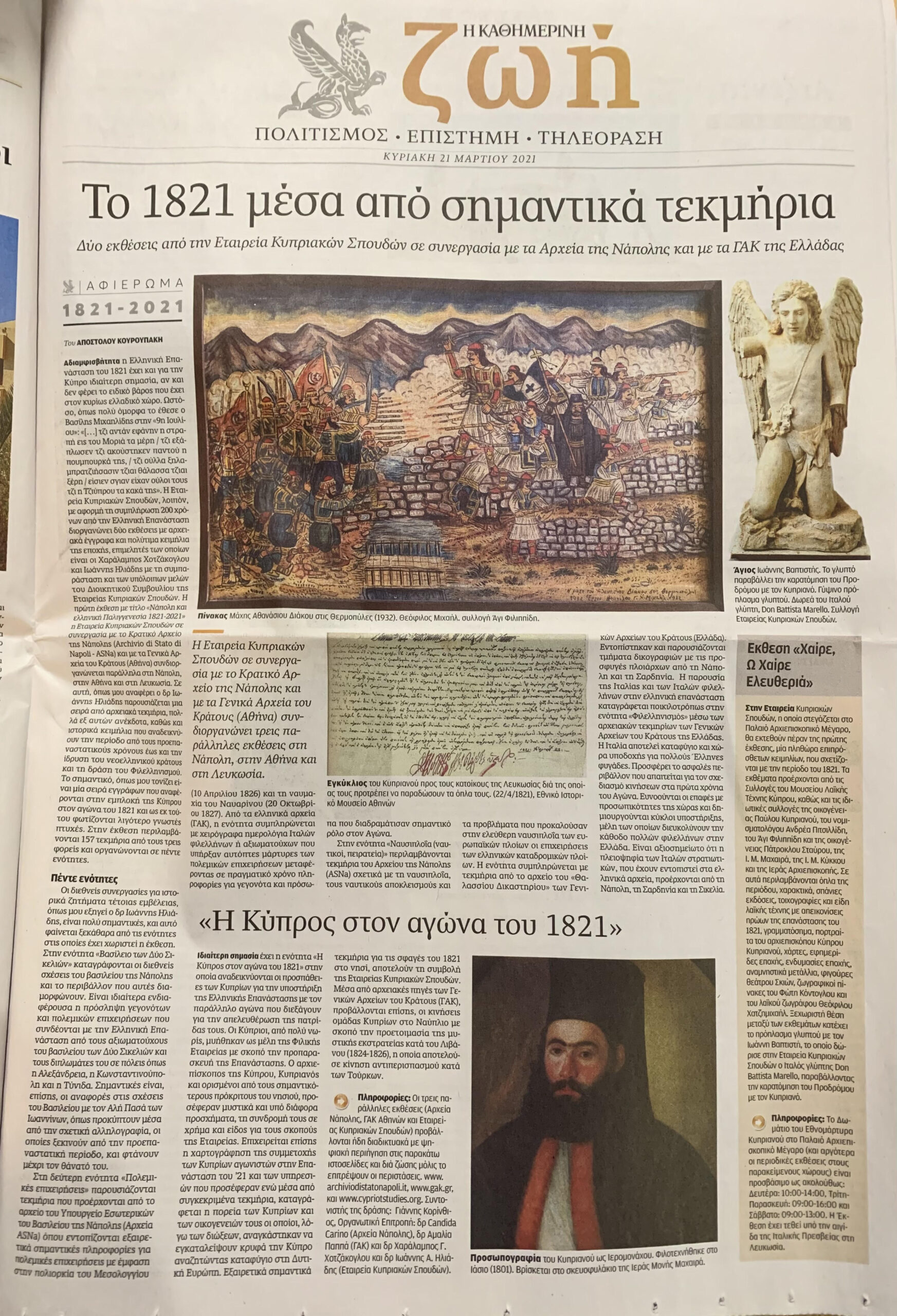 Η Εταιρεία Κυπριακών Σπουδών εξ αφορμής της συμπλήρωσης 200 χρόνων της ελληνικής Παλιγγενεσίας διοργανώνει δύο εκθέσεις με αρχειακά έγγραφα και πολύτιμα κειμήλια της εποχής.