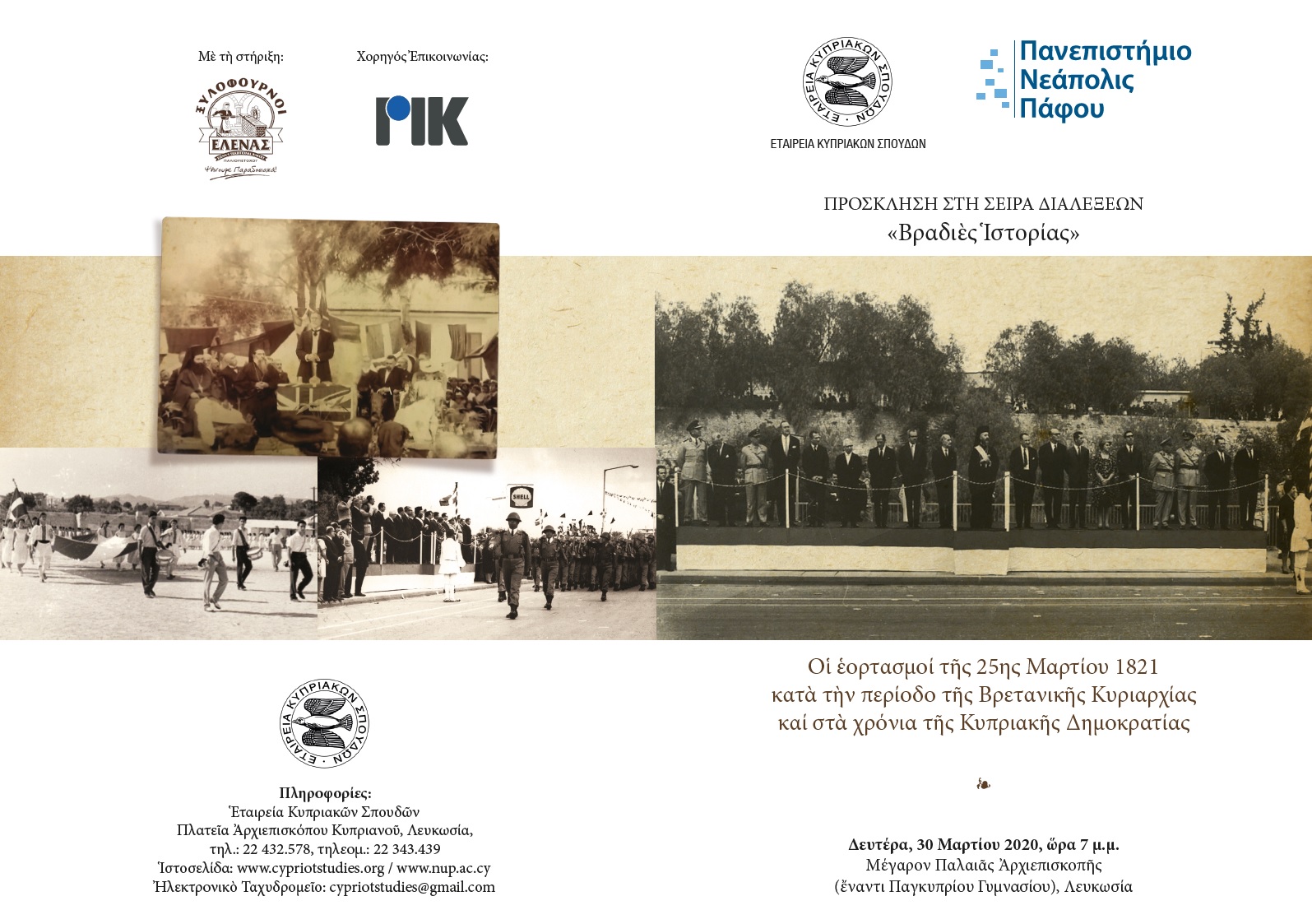 Βραδιές Ιστορίας με θέμα: Οι εορτασμοί της 25ης Μαρτίου 1821 κατά την περίοδο της Βρεττανικής Κυριαρχίας και στα χρόνια της Κυπριακής Δημοκρατίας