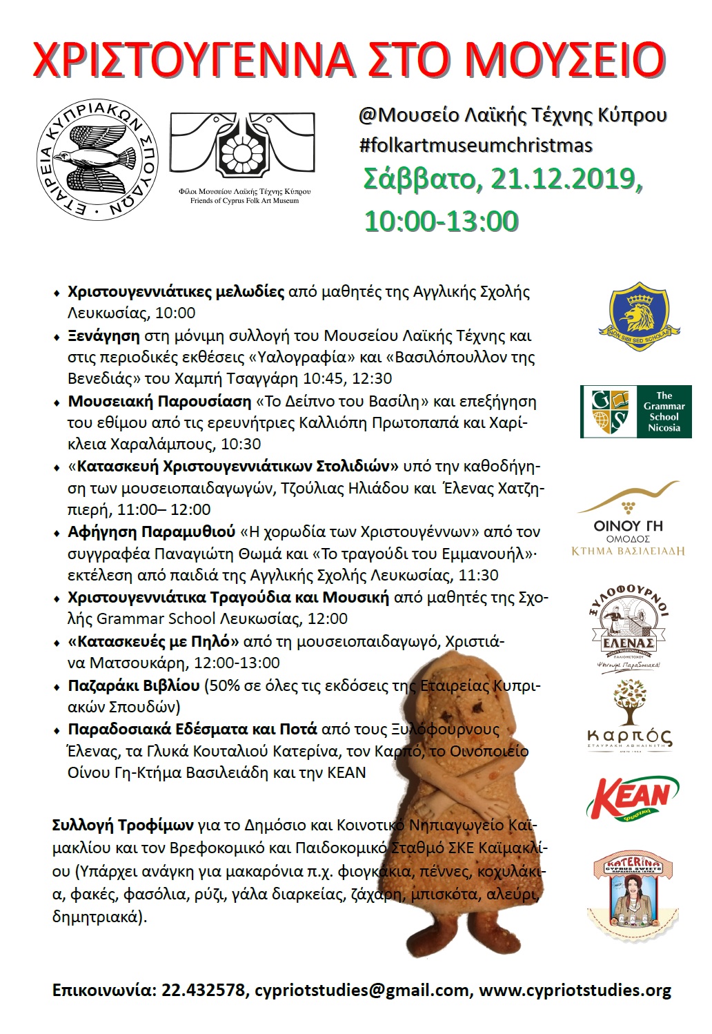 Σάββατο, 21.12.2019,10:00–13:00@Μουσείο Λαϊκής Τέχνης Κύπρου#folkartmuseumchristmas Χριστουγεννιάτικες μελωδίες από μαθητές της Αγγλικής Σχολής Λευκωσίας, 10:00Ξενάγηση στη μόνιμη συλλογή του Μουσείου
