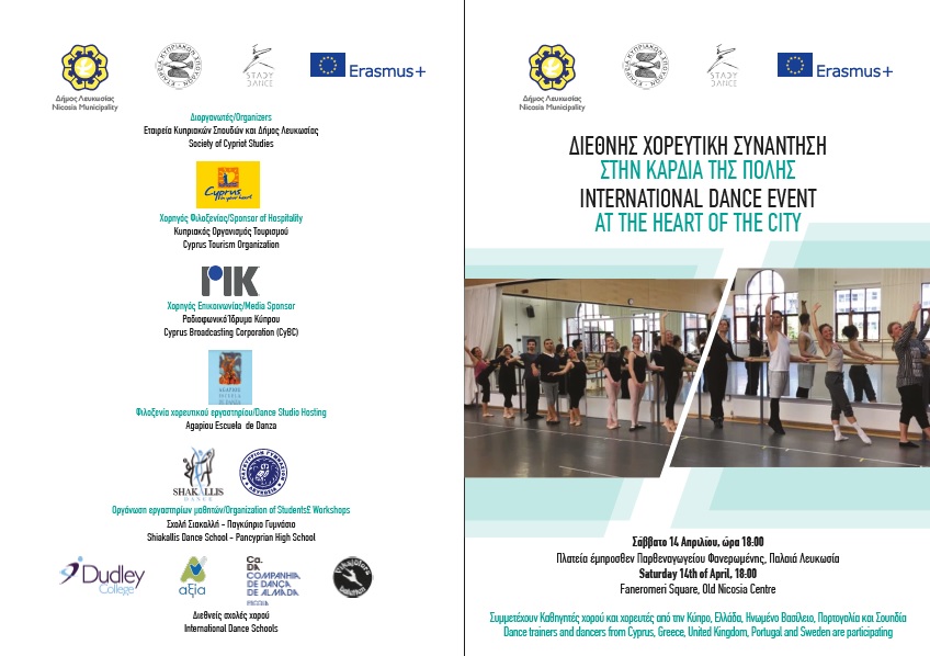 ΣΑΒΒΑΤΟ 14 ΑΠΡΙΛΙΟΥ, 18:00 – ΠΛΑΤΕΙΑ ΕΜΠΡΟΣΘΕΝ ΠΑΡΘΕΝΑΓΩΓΕΙΟΥ ΦΑΝΕΡΩΜΕΝΗΣ Η Εταιρεία Κυπριακών Σπουδών και ο Δήμος Λευκωσίαςσάς προσκαλούν το Σάββατο 14 Απριλίου 2018 στις 18:00 σεΔΙΕΘΝΗ ΧΟΡΕΥΤΙΚΗ ΣΥΝΑΝΤΗΣΗΣΤΗΝ ΚΑΡΔΙΑ ΤΗΣ ΠΟΛΗΣμε συμμετοχή εκπαιδευτών χορού από την Κύπρο, την Ελλάδα, το Ηνωμένο Βασίλειο, την Πορτογαλία και τη Σουηδία στο πλαίσιο του Ευρωπαϊκού Προγράμματος ERASMUS+ “S.T.A.DY DANCE: Skills and Tools to Address Diversity in Dance Training”.ΠΡΟΓΡΑΜΜΑΚαλωσόρισμα […]